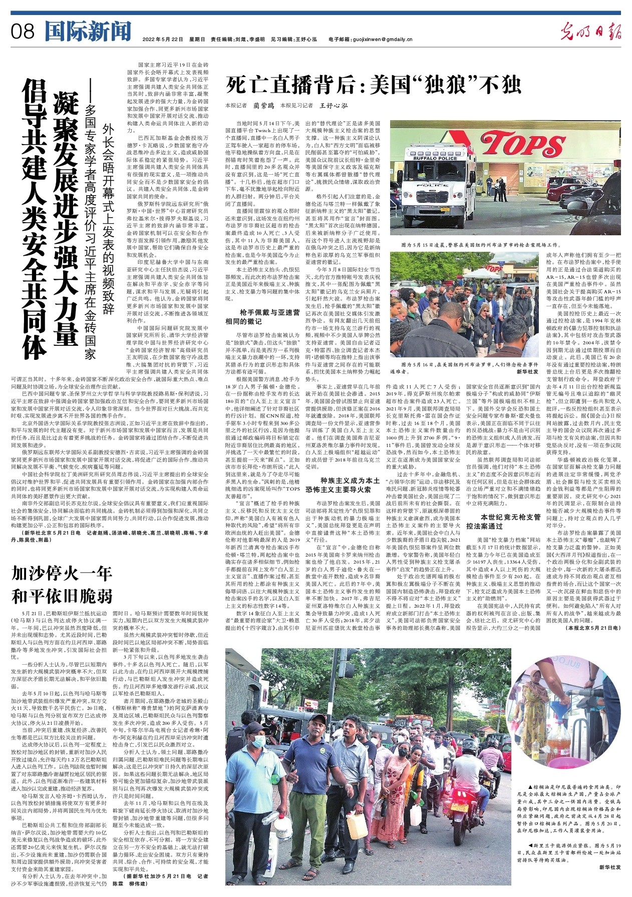 美国“枪支暴力档案”网站截至5月17日的统计数据显示,枪支暴力今年已在美国造成至少16197人丧生,13364人受伤,其中造成4人以上死伤的大规模枪击事件至少有203起。在种族主义、极端主义思想的推动下,枪支泛滥成为美国本土恐怖主义的“助燃剂”。