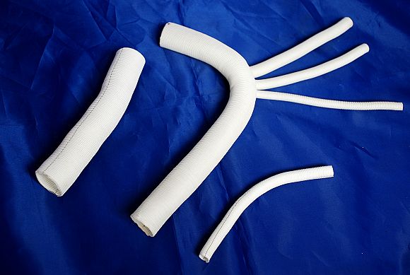 人造血管:20世纪50年代研制成功无缝的人造血管,并开始临床应用。对人造血管的要求是:物理和化学性能稳定;网孔度适宜;具有一定的强度和柔韧度;作搭桥手术时易缝性好;血管接通放血时不渗血或渗血少且能即刻停止;移入人体后组织反应轻微;人体组织能迅速形成新生的内外膜;不易形成血栓;以及令人满意的远期通畅率。