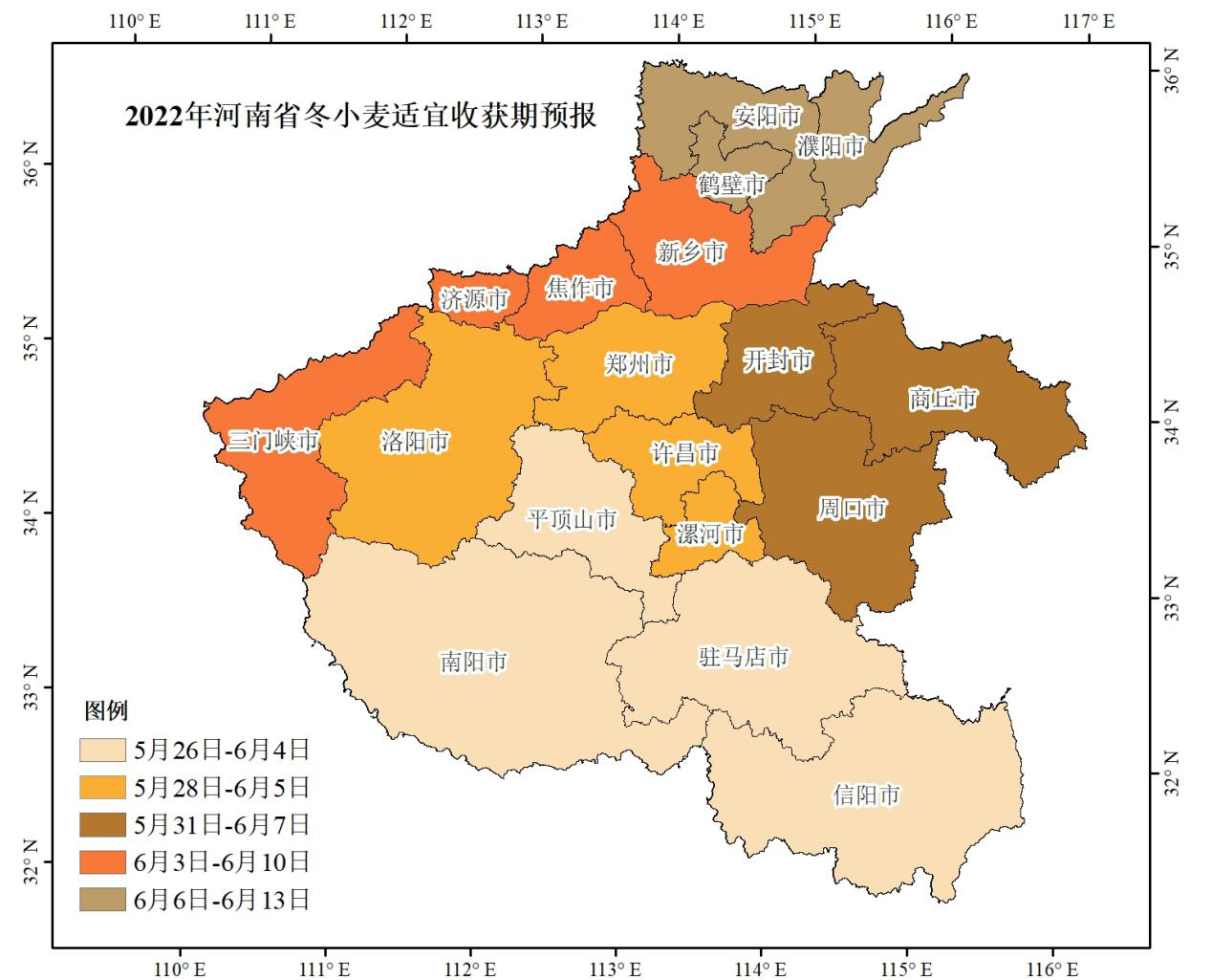 其中信阳、南阳、驻马店、平顶山适宜收获期在5月26日—6月4日;许昌、郑州、漯河、洛阳、适宜收获期在5月28日—6月5日;周口、商丘、开封适宜收获期在5月31日—7日;三门峡、焦作、济源、新乡适宜收获期在6月3日—10日;鹤壁、安阳、濮阳适宜收获期在6月6日—13日。