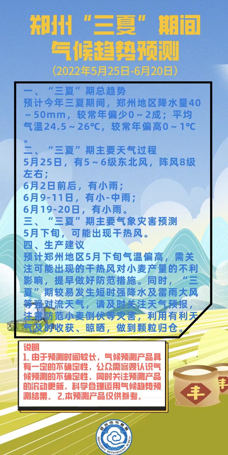 据郑州市气象台天气预报称,预计今年三夏期间,郑州地区降水量较常年偏少0~2成,平均气温24.5~26℃,较常年偏高0~1℃。