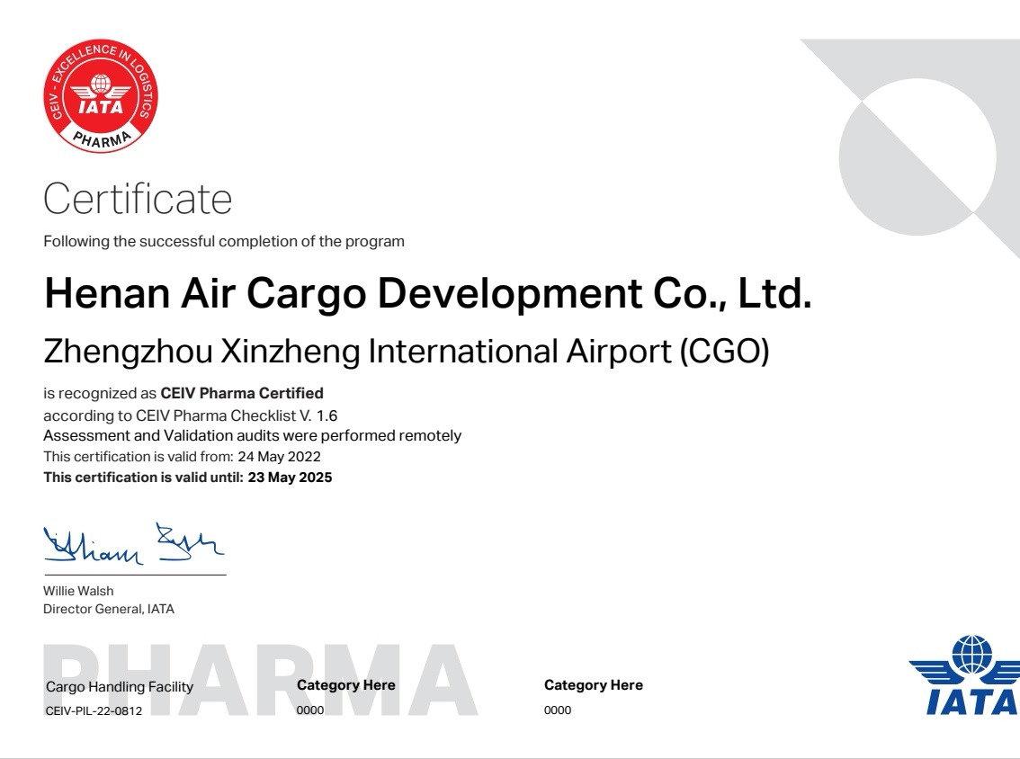 多年来,河南机场集团始终致力于提供快速高效、安全专业的药品保障服务。2019年12月,河南航空货运发展有限公司取得了世界卫生组织(WHO)和欧洲药品管理局(EMA)国际标准认可的医药行业良好分销规范(GDP)资质认证。
