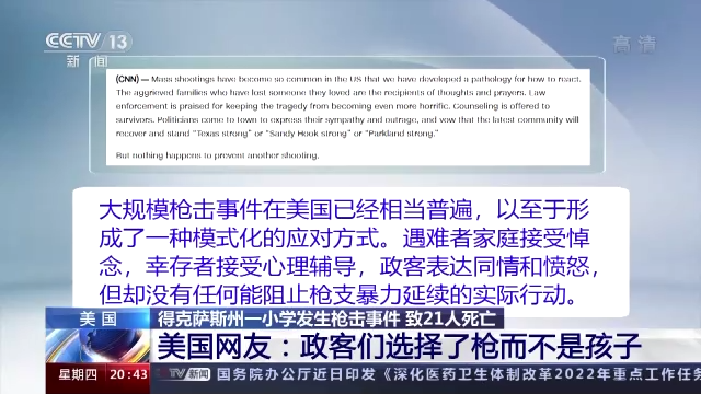 发生在美国得克萨斯州罗布小学的枪击事件,成为近十年来全美最严重的小学校园枪击案。事发后,央视记者走访了枪击现场。
