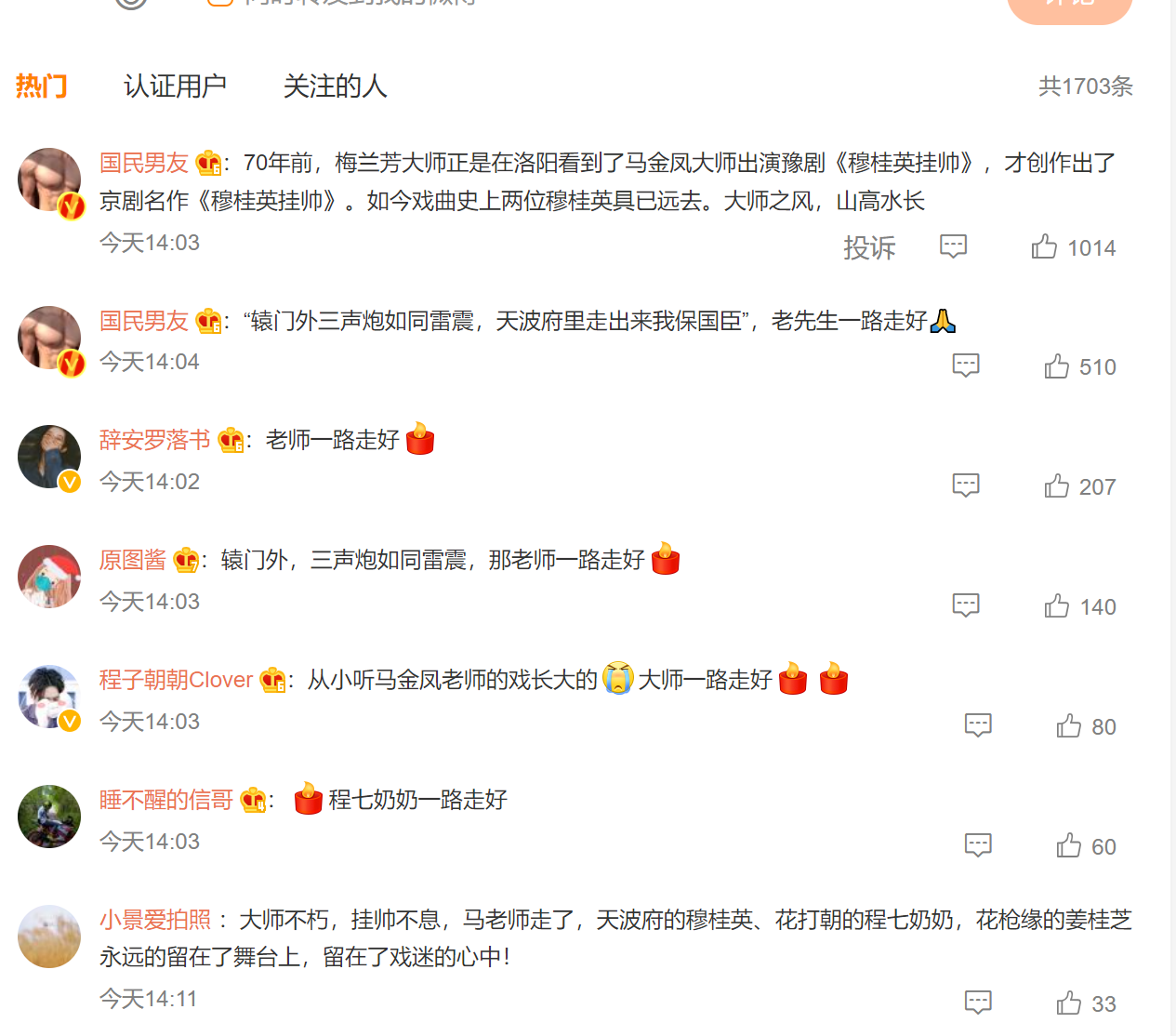 网友“Summer梓淅”怀念说:“小时候老跟着爸妈一起听马奶奶的戏,三十多年了到现在还能唱出来。从今往后只能缅怀了。”