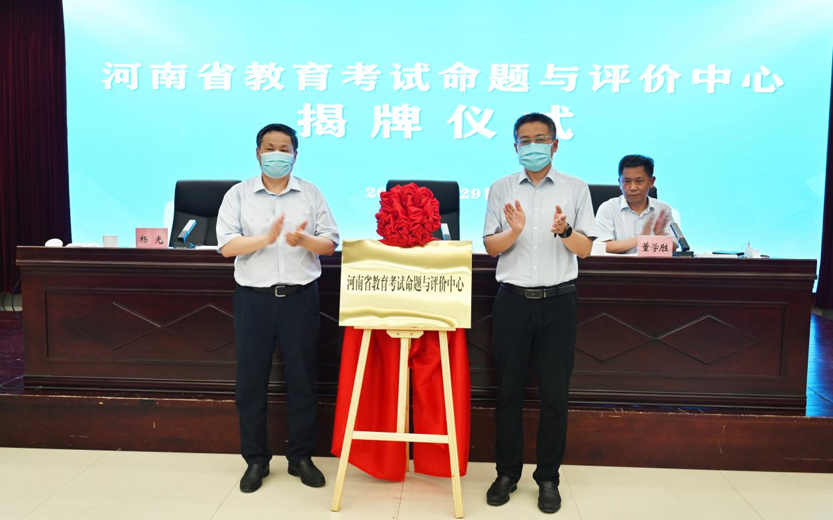 省教育厅党组成员、省教育考试院党委书记刘刚,省教育考试院院长董学胜,省教育厅二级巡视员杨光为河南省教育考试命题与评价中心揭牌