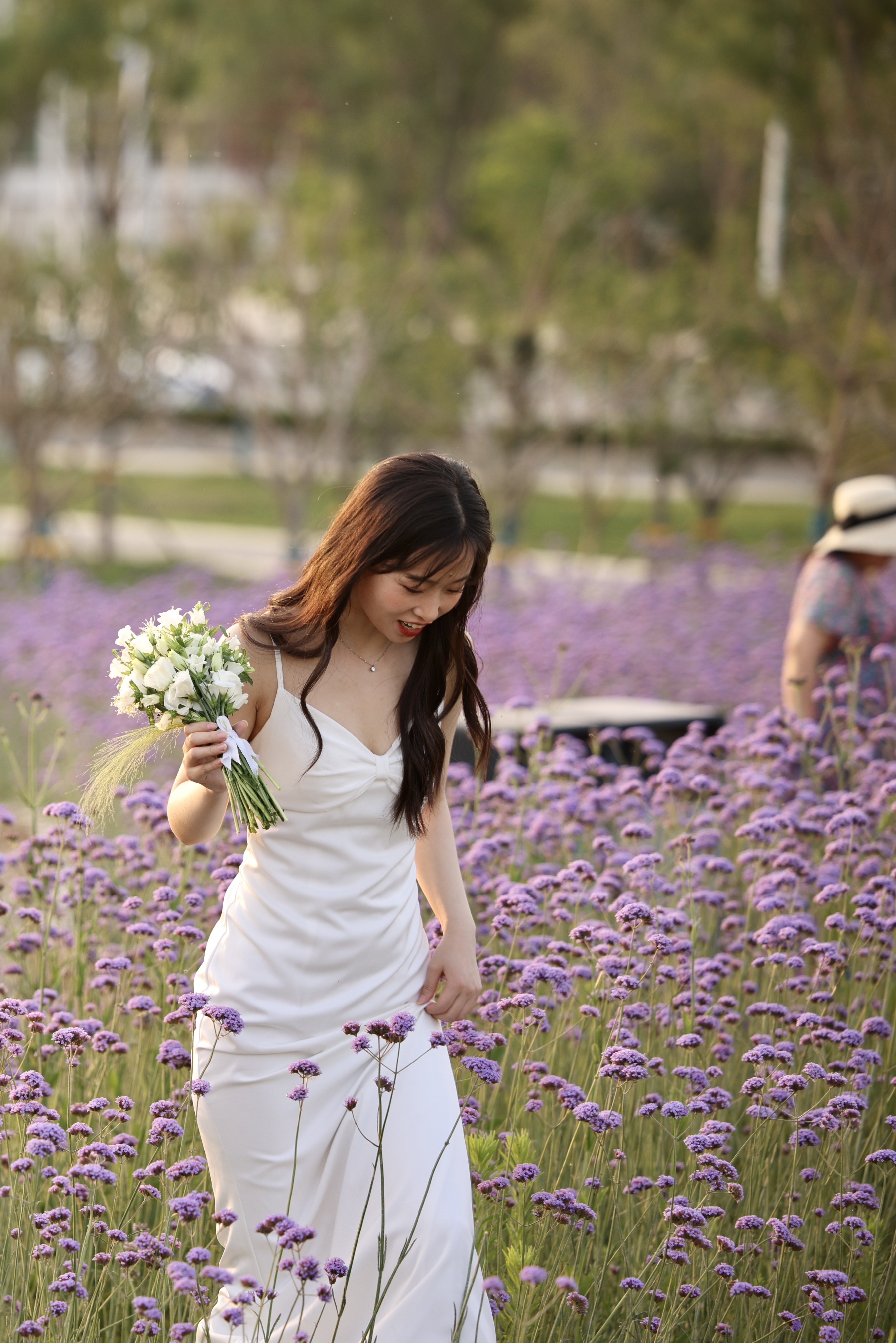 花丛中,一位女士正手捧鲜花