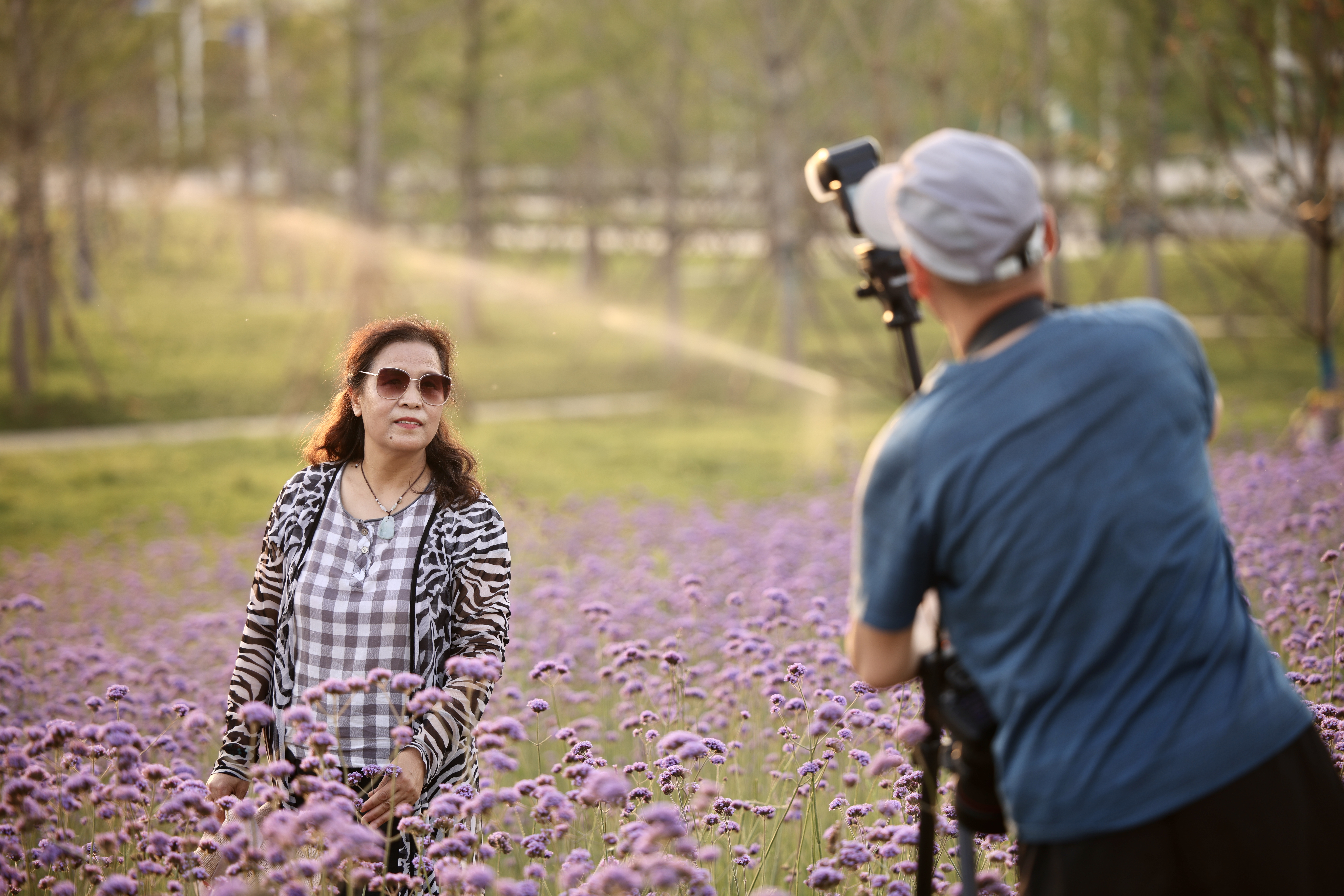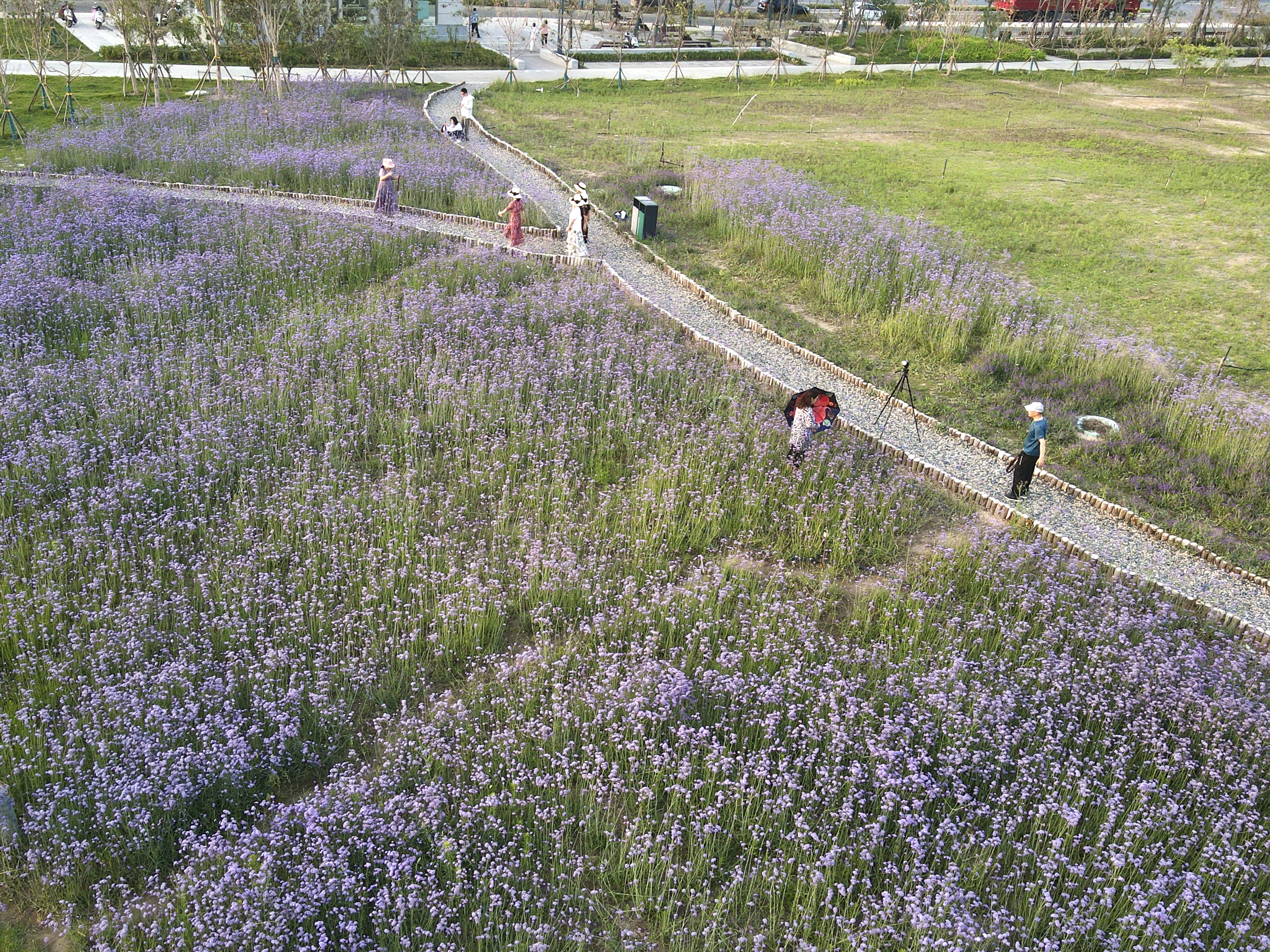大片马鞭草竞相开放,市民在紫色的花海里拍照留念