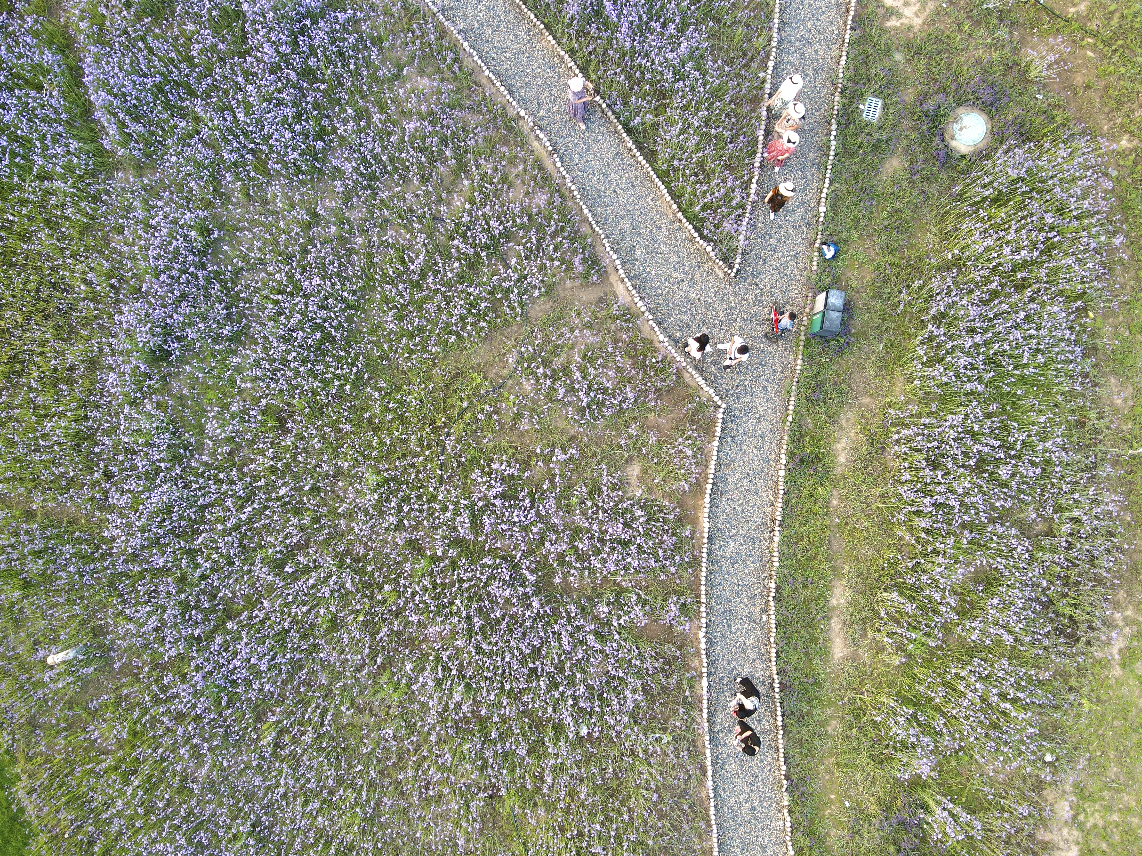 从空中俯拍,石子铺成的小路从紫色花海中穿插而过