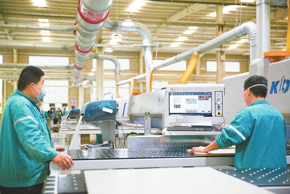 全友家私清丰公司的工人在科学防疫中紧张地生产。该公司在当地政府部门的帮助下,内部实行生产厂区全封闭式管理、严格落实一系列防疫措施,外部依托相关部门开设的绿色通道,保障了与上下游企业的畅通,实现了生产防疫两不误。