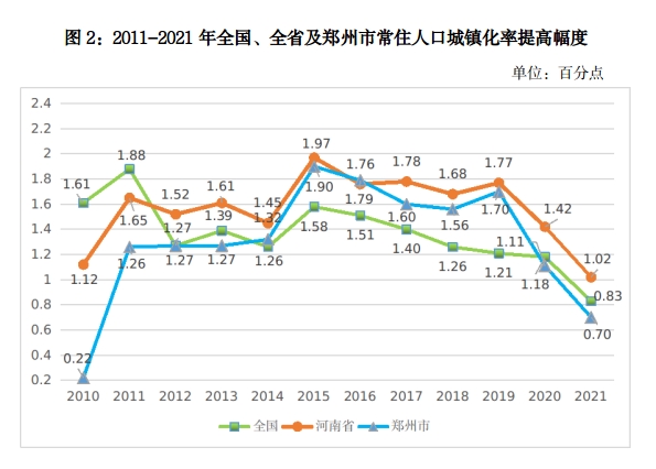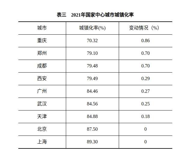 (二)在国家队中排名虽靠后,但增幅靠前。在国家中心城市中,全市城镇化建设水平仅高于重庆,略低于成都和西安。国家中心城市中城镇化率低于80%的四个城市分别是西安、成都、郑州和重庆。城镇化的优势在于能够在较小的区域内集聚众多的生产要素,以降低生产成本,使当地经济建设投资更加集中,效益更加显著。目前全市城镇化处于稳步推进阶段,仍有较大发展空间,从2021年城镇化率提高的幅度看,在国家中心城市中仅低于重庆,与成都并列第二。