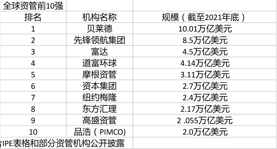 截至2021年底,进入全球资管10强的机构分别为贝莱德、先锋领航、富达、道富环球、摩根资管、资本集团、纽约梅隆、东方汇理、高盛、品浩(PIMCO)。与前1年的名单相比,前10内部的位次有所调整,前4名与头一年维持不变。摩根资管前进一步跃升至第5名,资本集团则退后1名,从前1年的第6跌落至第5。品浩从前一年的第7名跌至第10名,纽约梅隆、东方汇理、高盛较前1年分别前进1名。