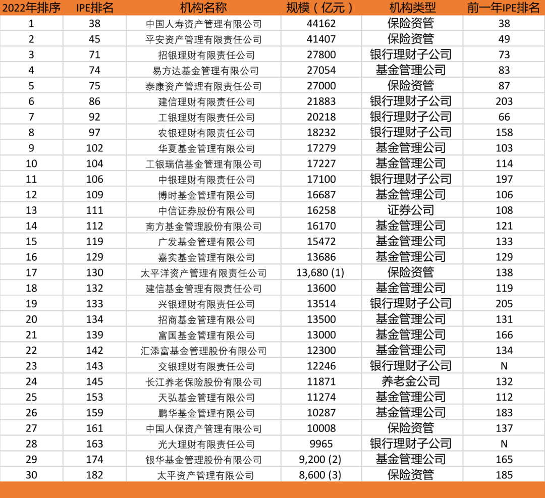 在 2022 年 IPE 500 榜单中,中国 30 强管理人的位置介于第 38 和第 182 之间。