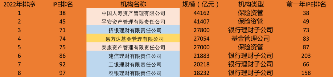 其中8家机构进入了全球100强,较前一年增加了两家。这8家机构,包含4家银行理财子公司,三家保险资管公司,一家公募基金(易方达)。其中,建信理财和农银理财为今年新进入全球100强的两家中国机构,建信理财较去年的排名前进了超过100名。