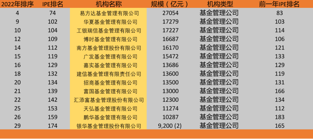 2022年共有 14 家基金管理公司进入 中国 30 强榜单,机构数量和具体入榜机构均与去年一致。广发基金全球排名从去年的133前进至119名,工银瑞信从去年的全球114名,前进至104名;南方基金从去年的121名前进至112名。鹏华基金也从去年的全球183名前进至159名,富国基金从去年的166名前进至139名。