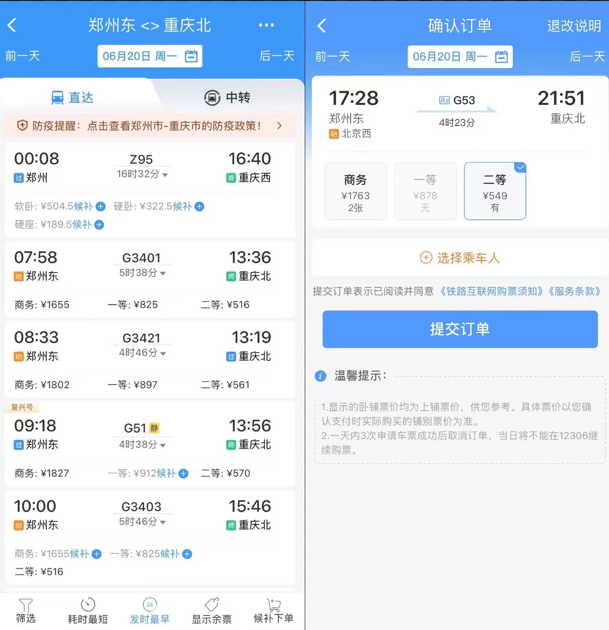 18日,记者登录12306App发现,6月20日的郑渝高铁各站车票已经陆续开售,输入郑州东—重庆,最快一趟列车是17时28分的G53次列车,到达重庆北需4时23分,二等座票价549元。