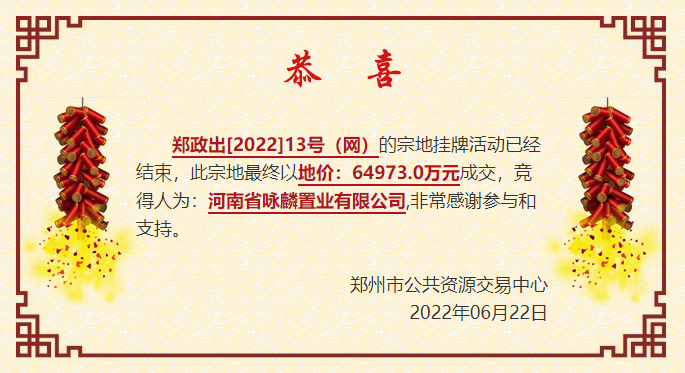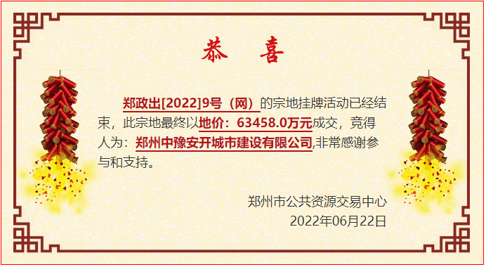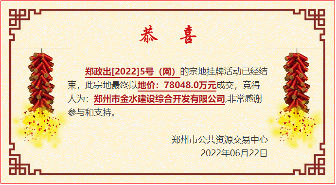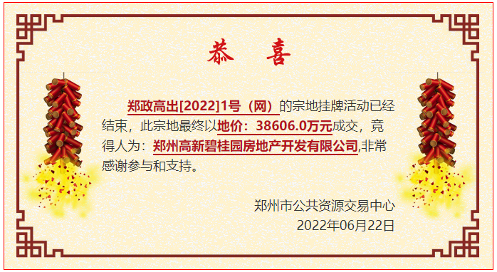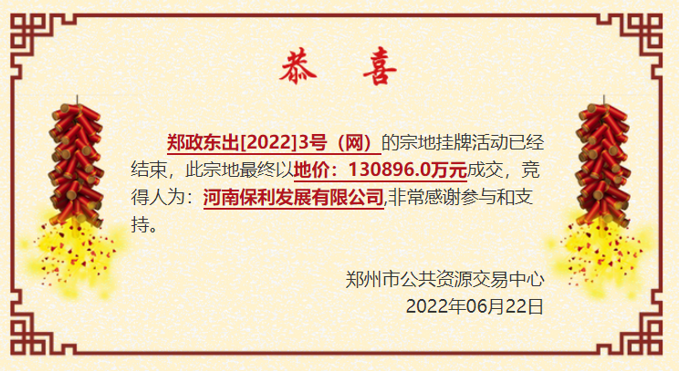 备受关注的5宗公开地由保利、郑州地产、龙湖地产、郑州地铁集团、碧辰置业竞得:北龙湖郑政东出〔2022〕3号(网)和郑政东出〔2022〕4号(网)分别由保利、碧辰置业竞得;郑政出〔2022〕3号(网)由龙湖地产竞得;郑政出〔2022〕9号(网)由郑州地产竞得;郑政高出〔2022〕2号(网)由郑州地铁集团竞得。