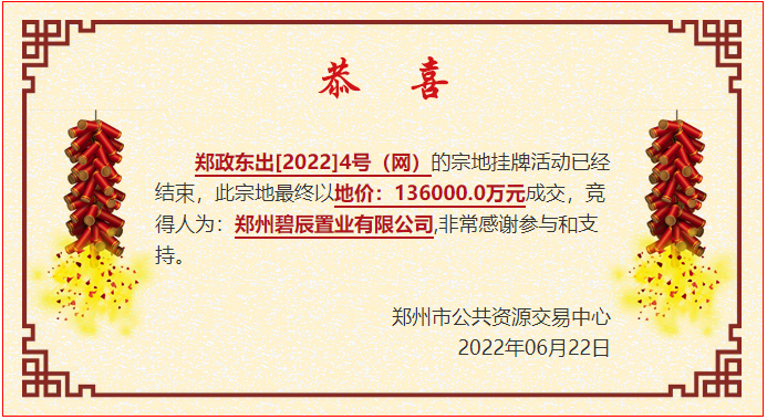 郑政东出〔2022〕4号(网)地块被碧辰置业(由交换空间有限公司和大有兴业创业服务有限公司持有)竞得,成交总价13.6亿元,楼面地价12050元/㎡,溢价率0%。该地块位于龙湖中环南路南、九如东路东,使用权面积61006.74㎡,土地用途为商务金融用地、城镇住宅用地(地下交通服务场站用地),容积率>1.0且<1.85,建筑密度<38.99%,建筑高度<24米,绿地率>30%。起始价136000万元,熔断价156400万元。