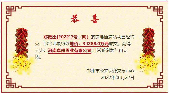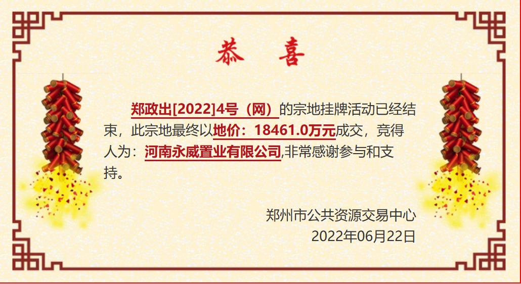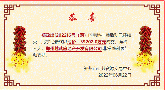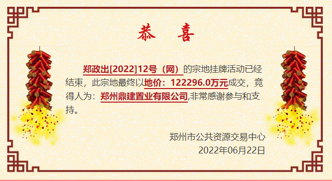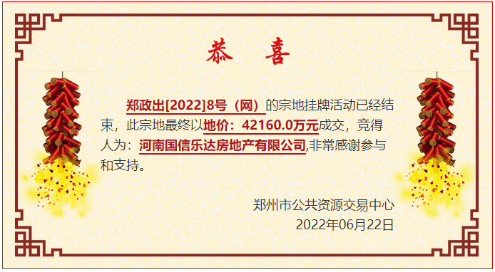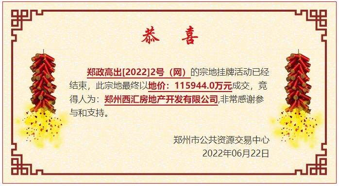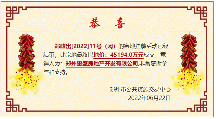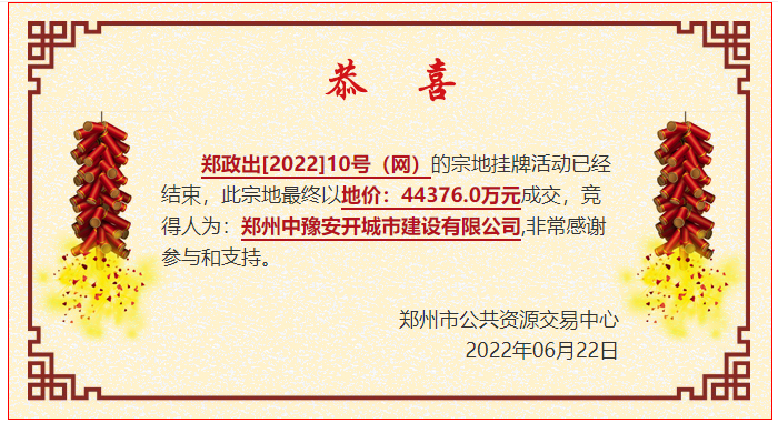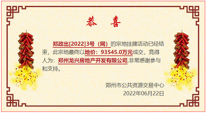 郑政出〔2022〕3号(网)被郑州龙兴房地产开发有限公司(龙湖地产旗下)以起始价9.35亿元竞得,楼面地价4812元/㎡,溢价率12.2%。该地块土地位置在童心路南、文德路西,使用权面积55537.78㎡,土地用途为城镇住宅兼容零售商业、餐饮、旅馆(地下交通服务场站用地),容积率>1且<3.5,建筑密度<25%,建筑高度<100米,绿地率>30%。起始价83345万元,熔断价95745万元。