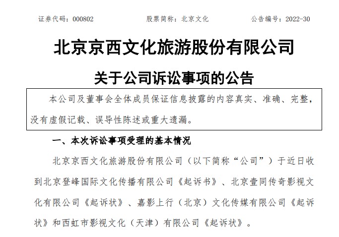 中新网7月7日电 7日,北京文化披露关于公司诉讼事项的公告。公告称,北京京西文化旅游股份有限公司于近日收到北京登峰国际文化传播有限公司《起诉书》、北京壹同传奇影视文化有限公司《起诉状》、嘉影上行(北京)文化传媒有限公司《起诉状》和西虹市影视文化(天津)有限公司《起诉状》,涉及金额高达1.57亿元人民币。
