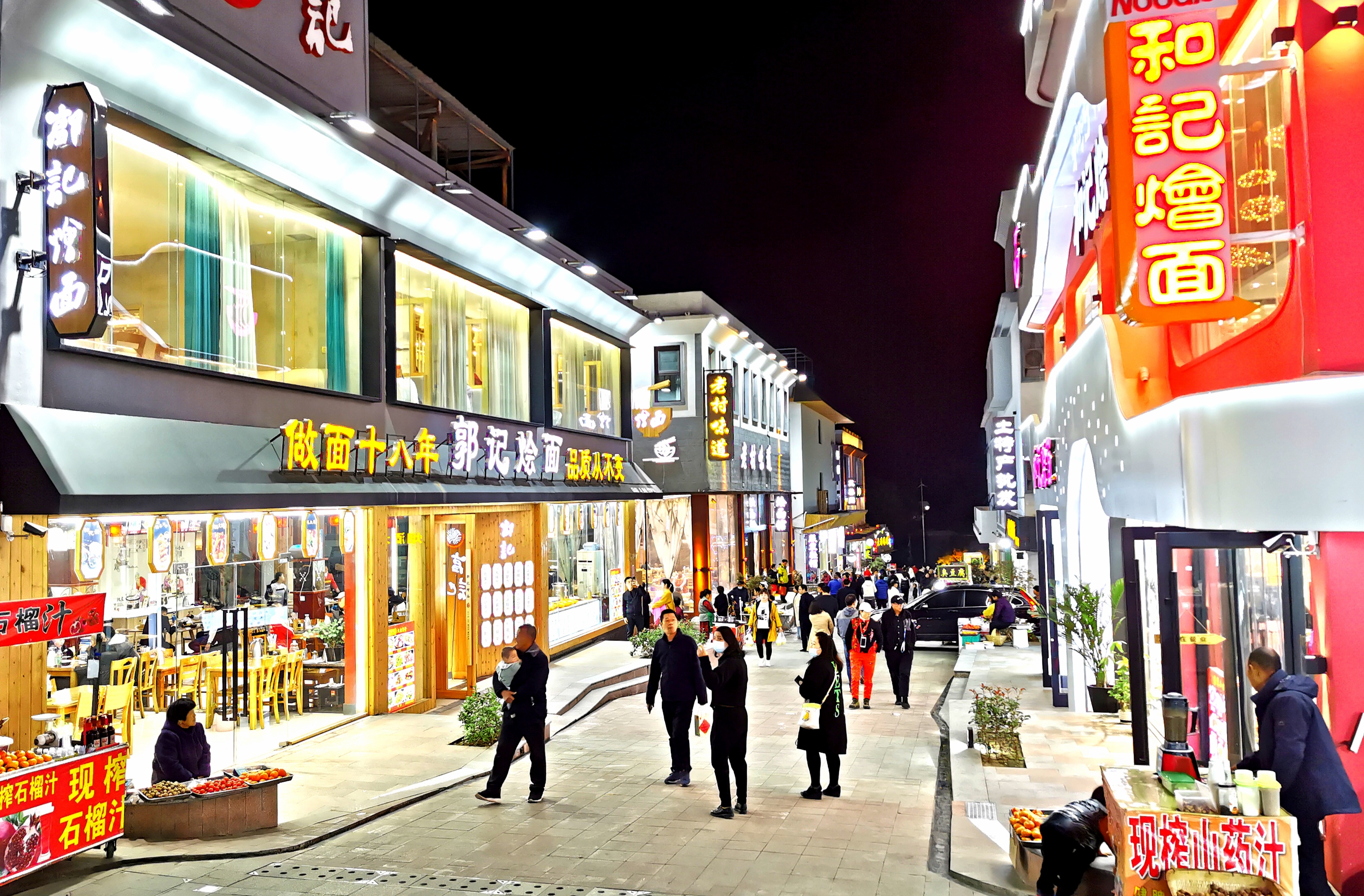 夜晚的岸上小镇,灯火辉煌,游人熙熙攘攘,小吃街、特产店、烧烤摊生意兴隆,夜生活再现昔日烟火气。