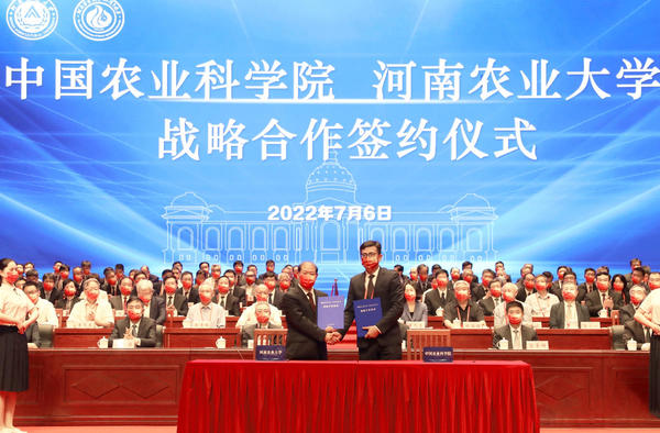 7月6日上午,在河南农业大学庆祝建校120周年暨创建中国特色世界一流农业大学推进大会上,河南农业大学校长介晓磊与中国农业科学院副院长孙坦代表双方签订协议,正式成为战略合作伙伴。