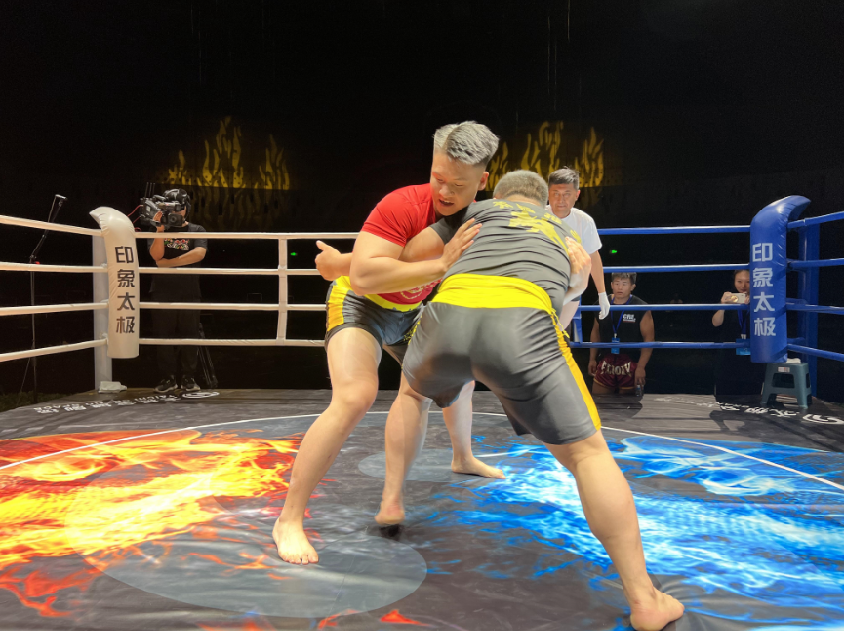 当晚太极推手项目决赛竞争激烈,分别角逐出了女子50、60公斤、60公斤以上、男子50、55、60、65、70、75公斤、85公斤以上等级别冠亚军。太极推手属于太极拳的双人徒手对抗练习,是最能表现出太极拳对抗性的一面,双方运用“掤、捋、挤、按、採、挒、肘、靠”等技法,争取迫使对方身体重心失去平衡,从而获取胜利。得益于太极拳的刚柔并济,太极推手既有武术竞技的激烈,又有和谐的东方韵律,十分具有观赏性。