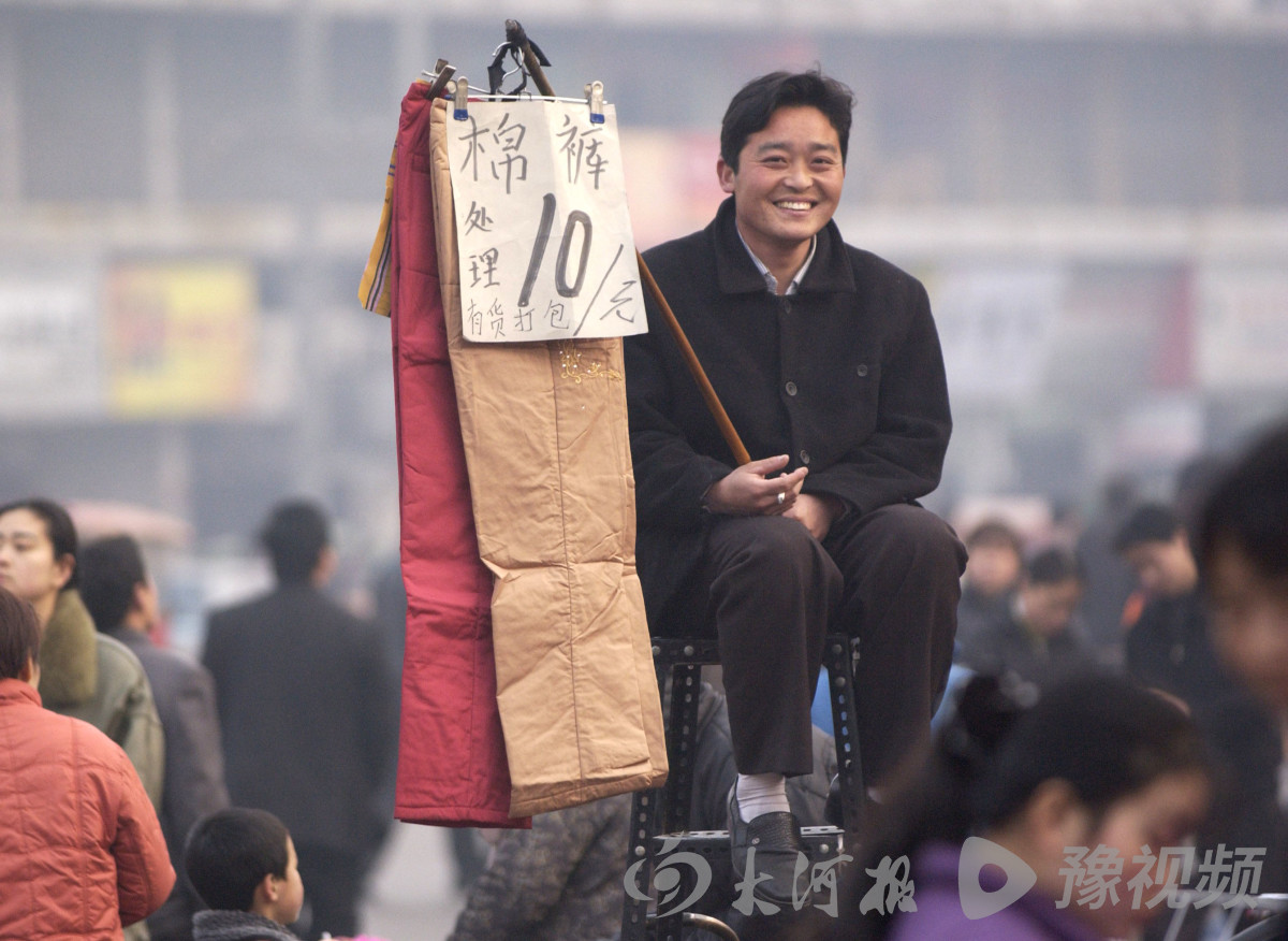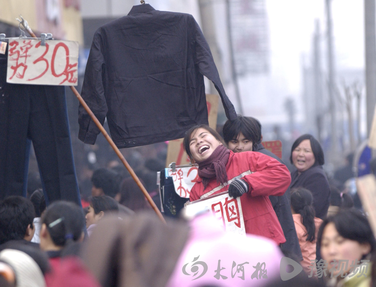 2003年1月20日,郑州市敦睦路服装市场上卖衣服的小贩儿。