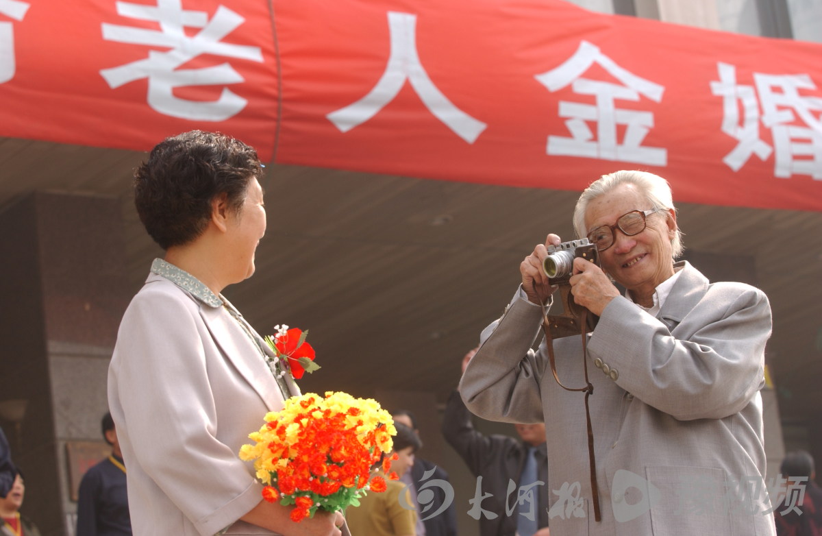 2002年10月14日,河南省人民大会堂门口,一对参加活动的金婚老人在拍照。