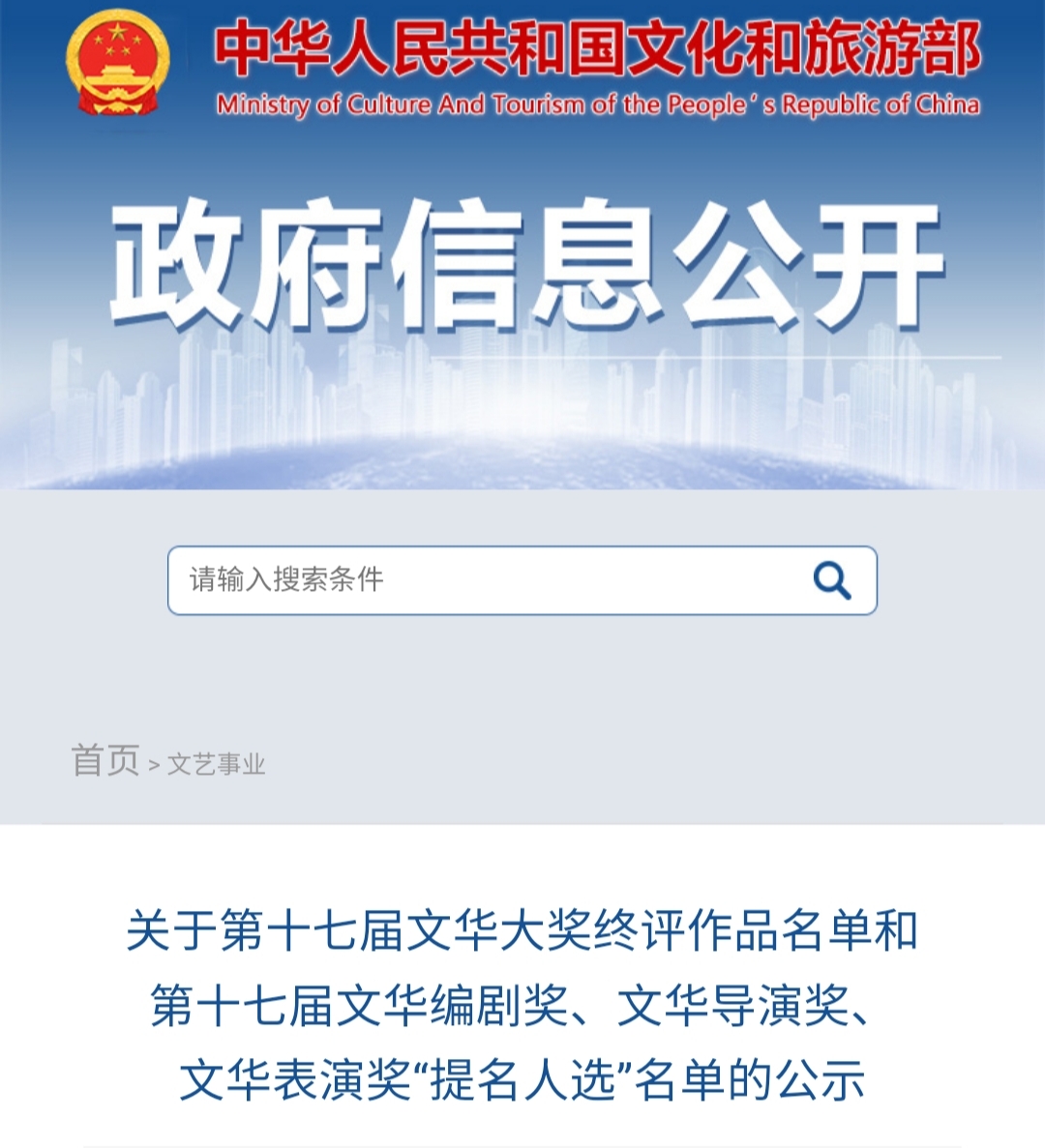 公示内容显示,评奖委员会根据《中国文化艺术政府奖——文华奖章程》《中国文化艺术政府奖——第十七届文华奖评奖办法》有关规定评选出结果,入围终评的作品和“提名人选”所对应的作品应参加第十三届中国艺术节现场演出。