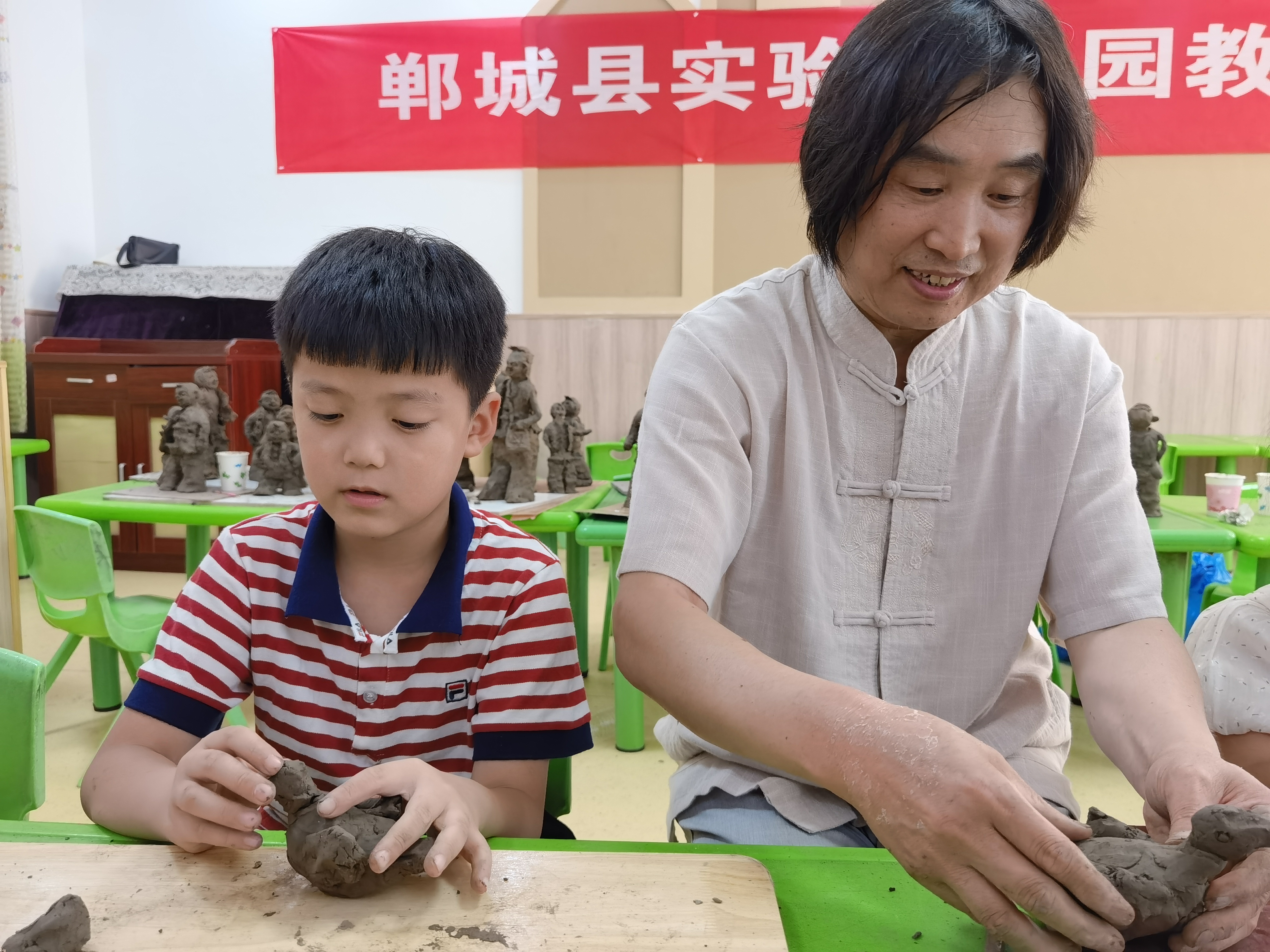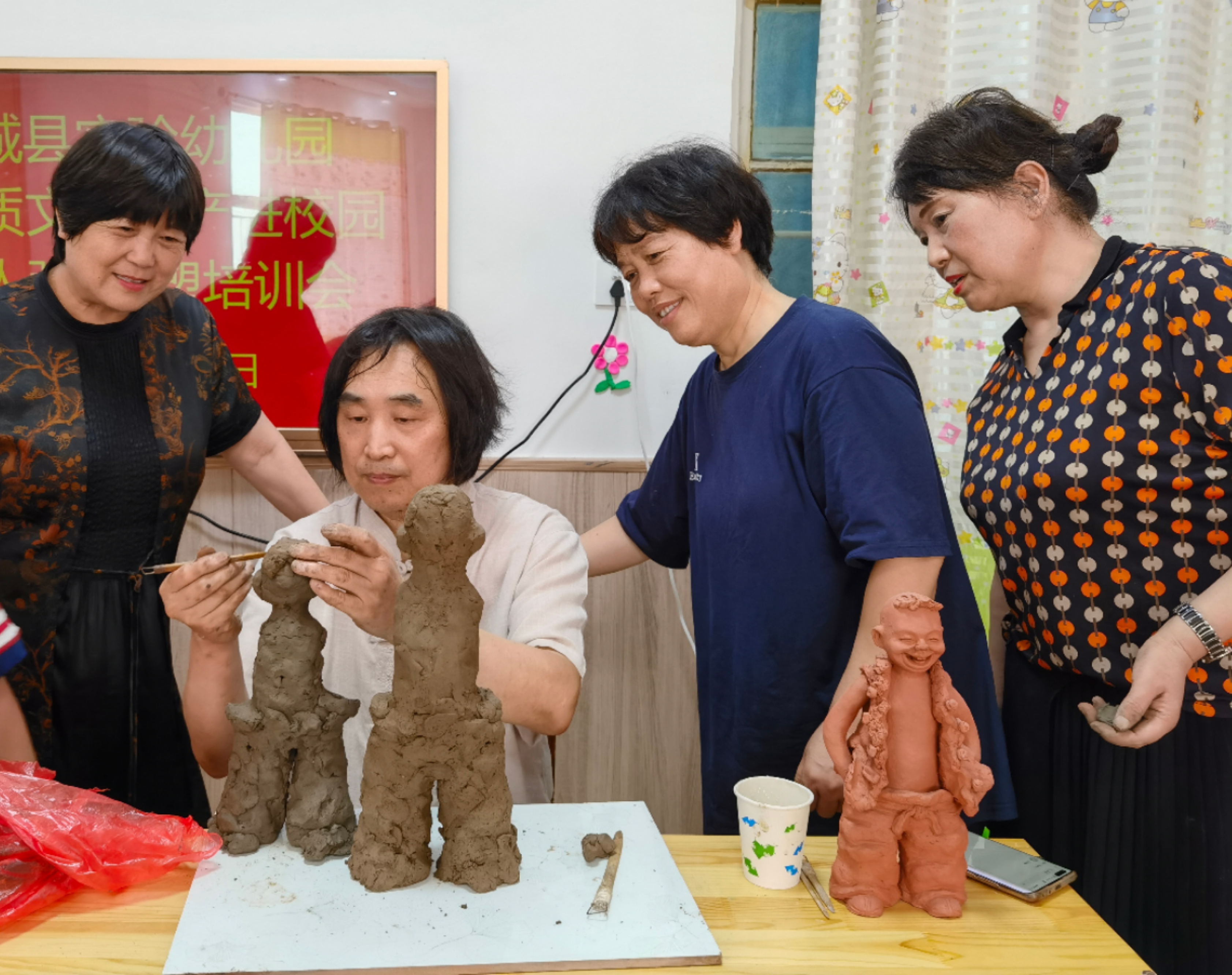 大河网讯 为积极开展非物质文化遗产进校园活动,7月25日,郸城县实验幼儿园邀请河南省省级非物质文化遗产示范性传习所负责人张振福给老师们上了一堂生动的泥塑课。