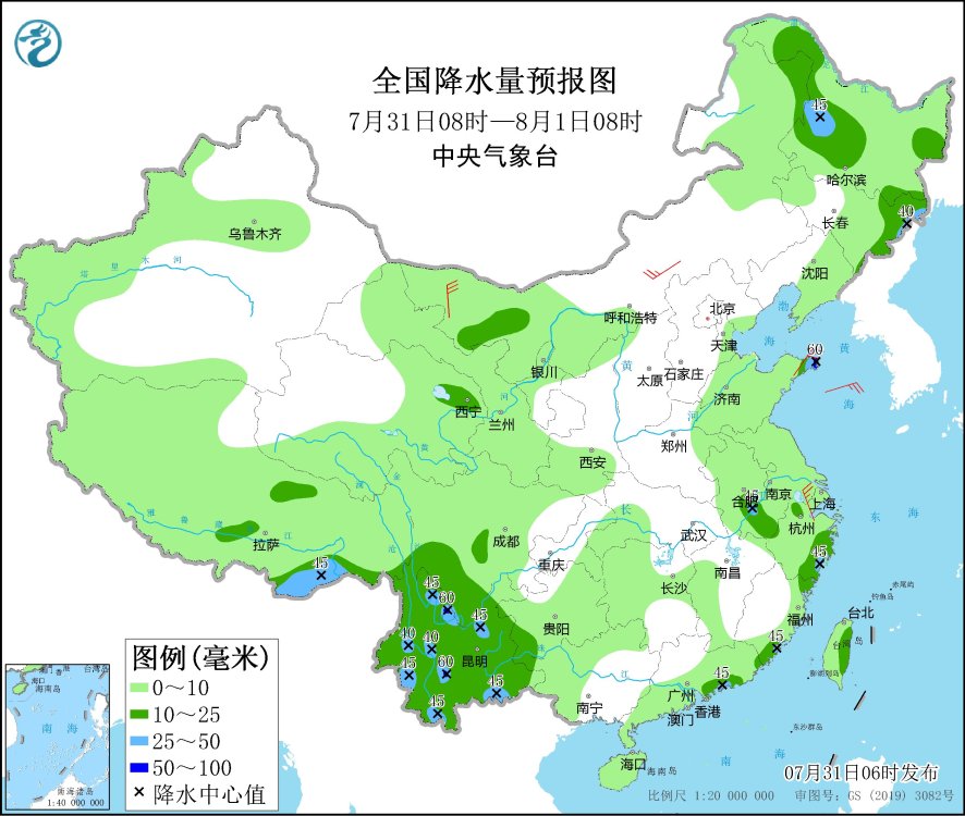 7月31日08时至8月1日08时,内蒙古东北部、黑龙江西部、吉林东部、山东半岛、安徽南部、浙江东部、广东东部、四川南部、云南等地的部分地区有中到大雨,局地暴雨(50~60毫米)。内蒙古中西部、山东半岛等地有4~6级风。