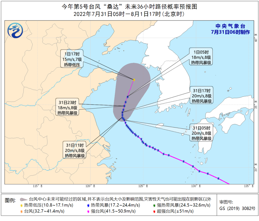 受“桑达”影响,7月31日08时至8月1日08时,山东沿海、江苏沿海、黄海大部、东海北部和东部将有6~7级风,“桑达”中心经过的附近海面风力有8级,阵风9~10级。山东半岛东部将有中到大雨。中央气象台7月31日06时继续发布台风蓝色预警。