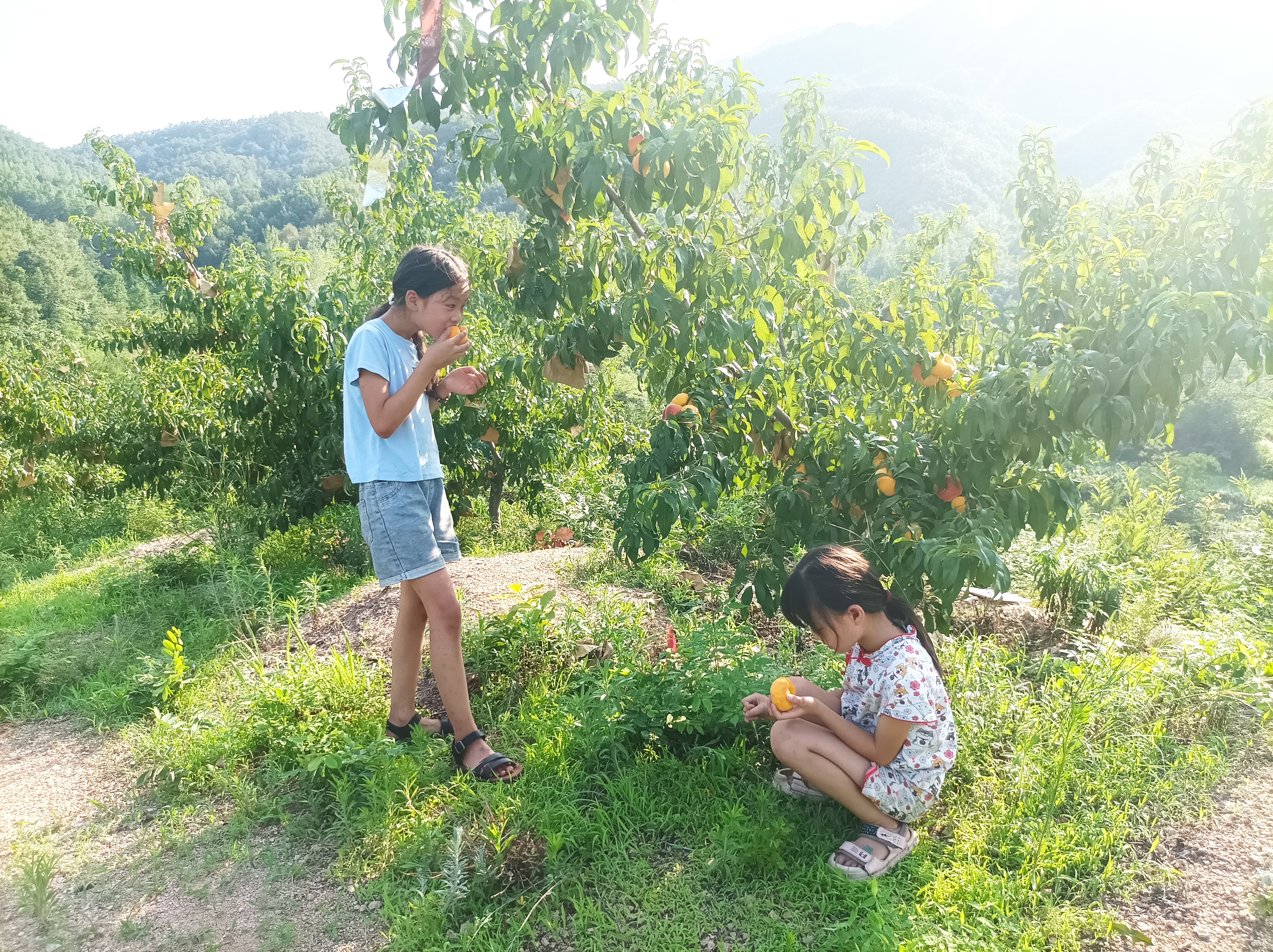 孩子们在桃树下吃桃