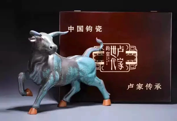 “这件炉钧作品叫《守望》,是去年辛丑牛年贺岁作品。”卢占召带领我们来到一件牛的作品前介绍说,“《守望》是根据‘三牛’精神设计的,用传统技艺展现出新时代的内涵,这也是我们卢家钧瓷献给党的百岁生日礼物!”从卢占召的话语中,能够感受到一个钧瓷匠人对党和国家的热爱之情。