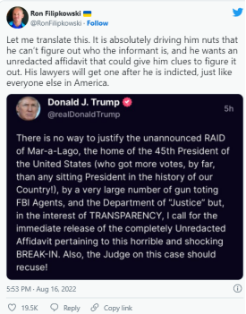 对于特朗普要求公开宣誓书的相关言论,菲利普科夫斯基当地时间16日在推特发文表示,特朗普是希望通过此举帮助自己找出告密者,“让我来翻译一下。查不出谁是线人绝对让他抓狂,他想要一份未经删减的宣誓书,这样就能通过线索搞清楚事实真相。”推文下方配上了特朗普此前指责FBI“突袭”海湖庄园,并要求立即公开宣誓书等文件的截图。↓