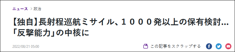 【环球时报-环球网报道 记者郭媛丹】日本《读卖新闻》21日报道,日本正在考虑部署1000枚以上的远程巡航导弹,以加强对中国的反击能力,报道将日本的这种打算归因于“台海局势”。军事专家对《环球时报》记者表示,日本早在2020年就表示其要发展中远程巡航导弹,对此事谋划已久。1000枚不仅仅是一个数字,其涵义在于“日本已具备批量生产远程巡航导弹的能力”,而日本选择此时机来“透风”可谓是心机重重。
