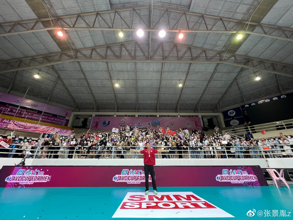 此次亚洲杯在泰国进行。颁奖仪式开始前,当镜头转向看台,不少观众挥舞着应援灯牌和助威横幅,上面的主角几乎无一例外,都是张景胤。