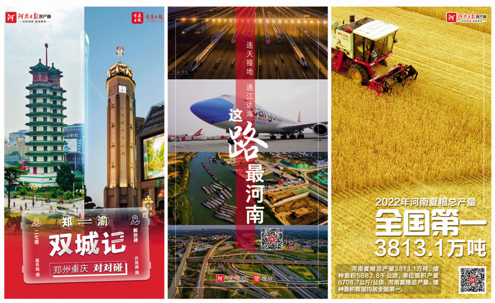 针对郑渝高铁、济郑高铁濮郑段开通这一民生报道,河南日报推出短视频《来河南耍噻》、通讯《喜看“米”字落中原》、长图《濮郑高铁〈诗经〉之路》、条漫产品《从古至今,河南到重庆的N种方法》等多种形式的全媒体产品。其中,河南日报与重庆日报联动推出的海报产品《这对CP,我嗑定了》,通过集中选取郑州与重庆方言、交通、建筑、文化、饮食等各个方面的关联点,以网络语言“嗑CP”为创意点,用对对碰的形式隔空“表白”,集中展示两地风土人情。相关微博话题登上微博热搜榜,阅读量破亿。