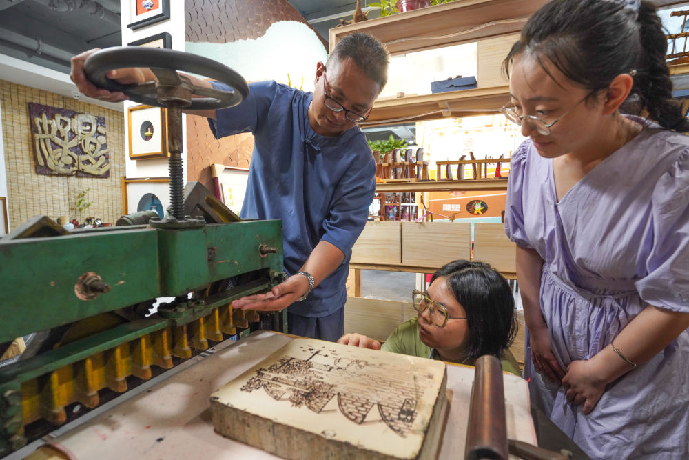 二砂文化创意园内,造物记创始人葛爱峰(左一)与设计师在调试老式石版印刷设备(马健/ 摄)