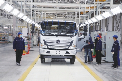 河南福田智蓝新能源汽车有限公司生产车间内,工人正有序工作。