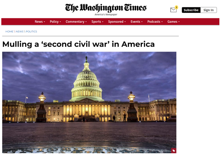 美国《华盛顿时报》网站8月28日发表评论文章《在美国 认真思考一场“第二次国内战争”》,指出美国当下政治分歧严重,有充分的数据显示部分美国民众确信这个国家的未来将面临第二次内战。