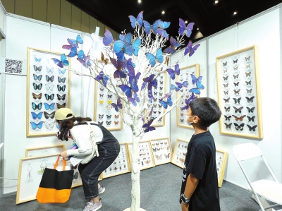在一楼展区内,观众解锁着一个又一个奥秘。在蝶语世界昆虫博物馆内,奇异昆虫的标本体形特大、色彩鲜艳,吸引了不少孩子与昆虫爱好者们驻足。