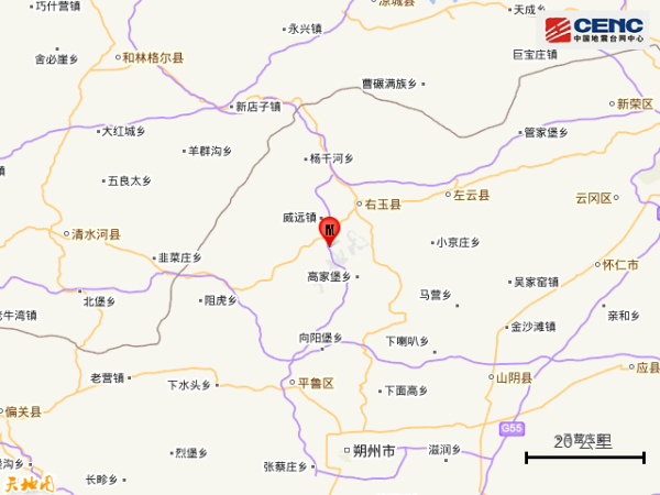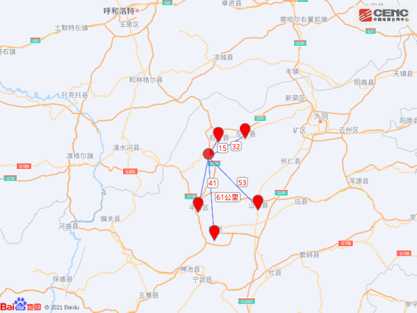 周边县城:震中距右玉县15公里、距左云县32公里、距平鲁区41公里、距山阴县53公里、距朔城区61公里,距朔州市60公里,距呼和浩特市118公里。