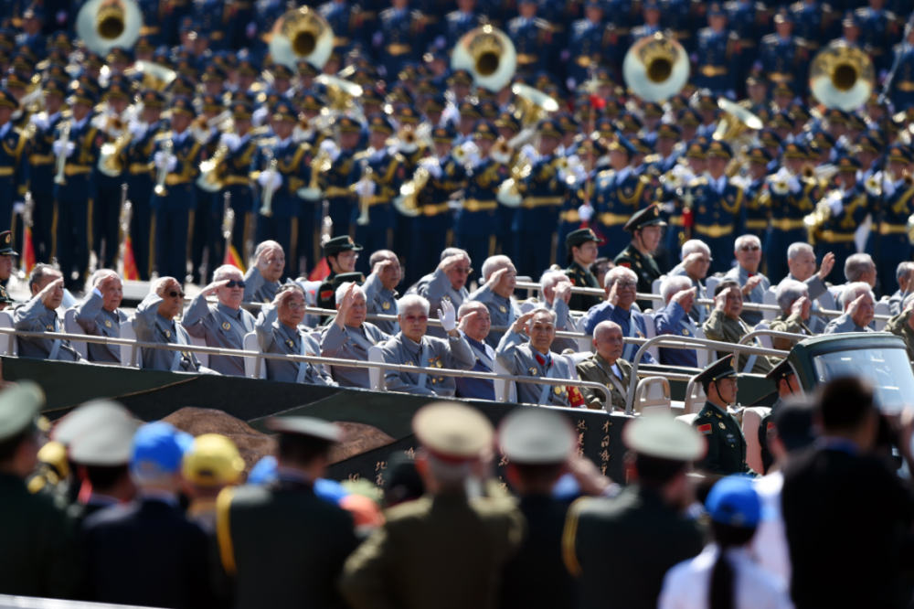 2015年9月3日,中国人民抗日战争暨世界反法西斯战争胜利70周年纪念大会在北京隆重举行。这是抗战老兵乘车方队通过天安门广场。新华社记者王定昶摄