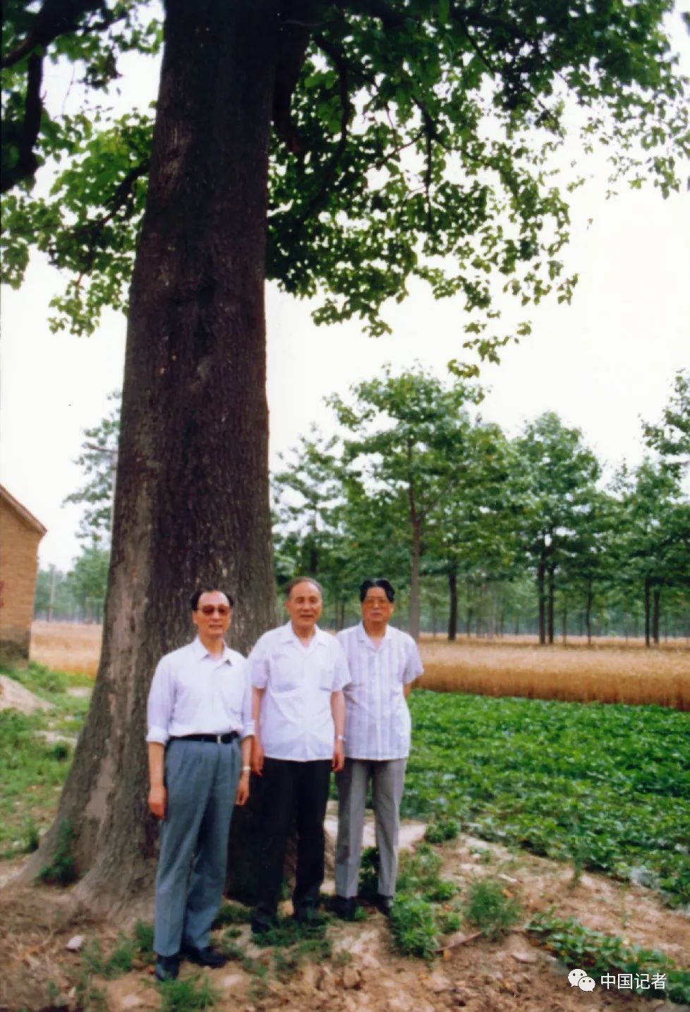 1990年,穆青、冯健(左一)、周原在焦裕禄当年种植的“焦桐”前留影。赵德润摄