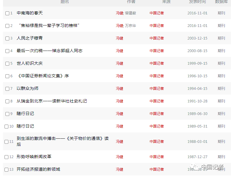 冯健在《中国记者》刊发的部分文章标题截屏。