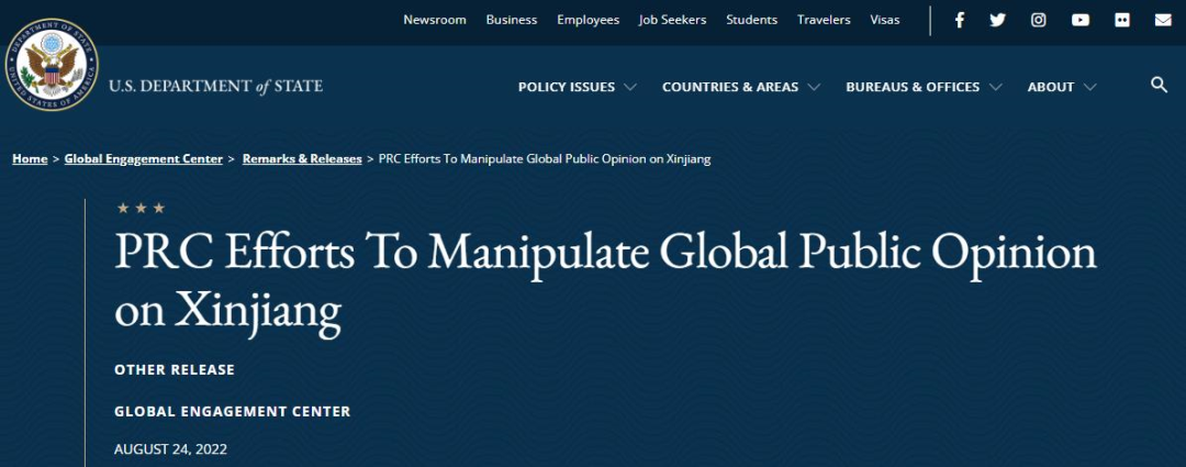 同样是在8月24日,美国国务院也发布了一份“披露”中国如何操纵新疆议题的报告。