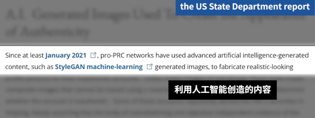 美国国务院在报告中写道:“……使用了先进的人工智能技术生成内容。”而斯坦福的报告称 “很可能是使用人工智能技术创建的图片当头像来伪装成真人”。