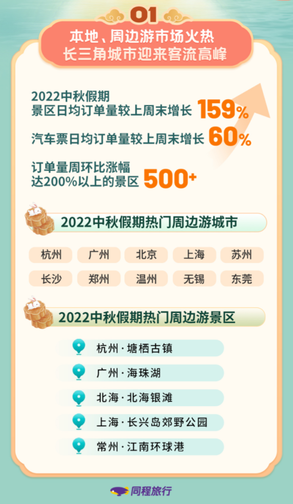 中秋假期,各大城市市内及周边近郊的景区迎来客流小高峰。同程旅行大数据显示,今年中秋假期,景区日均订单量较上周末增长159%,其中,订单周环比涨幅达到200%及以上的景区超过500个。短途出行为主的汽车票,日均订单量较上个周末增长60%。周边游和近郊游人流主要聚集于各大核心城市及周边。