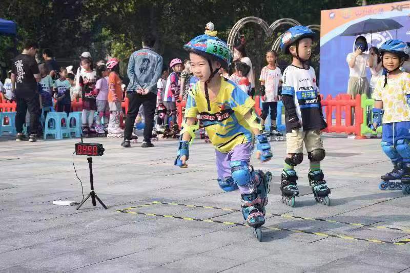 仲秋时节,秋高气爽,晨光微露,小选手们早早到达比赛场地,在赛场外摆上了一排排五色的角标,开始了赛前热身。赛场上选手们个个生龙活虎在角标间极速地穿梭呼啸而过,创造一个个佳绩。此次赛事设速度轮滑和自由式轮滑两个大项,其中速度轮滑下设成青组、少年甲组、少年乙组、少年丙组、少年丁组、儿童甲组、儿童乙组7个组别,自由式轮滑大项下设速度单脚过桩、双鱼速度过桩、前交叉速度过桩三个小项。
