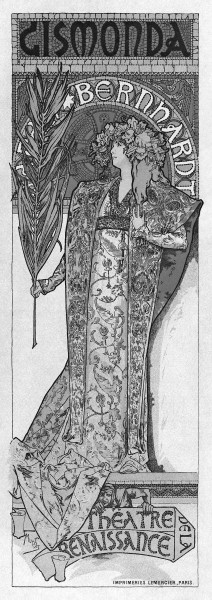 《吉斯蒙达》戏剧海报高达两米多,海报上的伯恩哈特身着一袭拜占庭贵族的金色长袍,头戴鸢尾花冠头饰,身披植物纹样披肩,手持棕榈枝。歌剧《吉斯蒙达》讲述的是中世纪希腊女公爵吉斯蒙达和平民的爱情故事。海报描绘的是戏剧高潮场景中女主角吉斯蒙达拿着棕榈枝参加“棕枝主日游行”的一个瞬间的姿态。海报的创新之处是吉斯蒙达脑后华丽的彩虹形拱门,像一个光环,让光线聚焦在女主人公的脸上。唯一的背景装饰是吉斯蒙达脑后的拜占庭马赛克瓷砖,其余部分均为留白。与当时典型的鲜艳繁复的海报不同,这张海报具有韵律化的线条、简洁的轮廓线,以及高雅内敛的色彩。海报的顶部带有标题《吉斯蒙达》,底部简洁地呈现了戏剧的演出信息:文艺复兴剧院。简单的构图突出了演员的主体地位,将真人大小的人物放在拱形轮廓中,突出了吉斯蒙达的尊严和个性,同时也符合伯恩哈特的戏剧理念。她曾说:“舞台上最为至关紧要的是我们,是演员。这种类型的垃圾(过于繁复的舞台布置)会分散观众的注意力。”19世纪90年代的法国剧场,布景和服装都开始追求现实主义风格,戏剧演出中也增加了取材于日常生活的真实细节。而伯恩哈特的戏剧理念对当时的戏剧思潮来说,是独特且先锋的,与21世纪著名的戏剧导演格洛托夫斯基的“贫困剧场”理念相似:舞台布景扼杀了戏剧的本质——演员和观众。